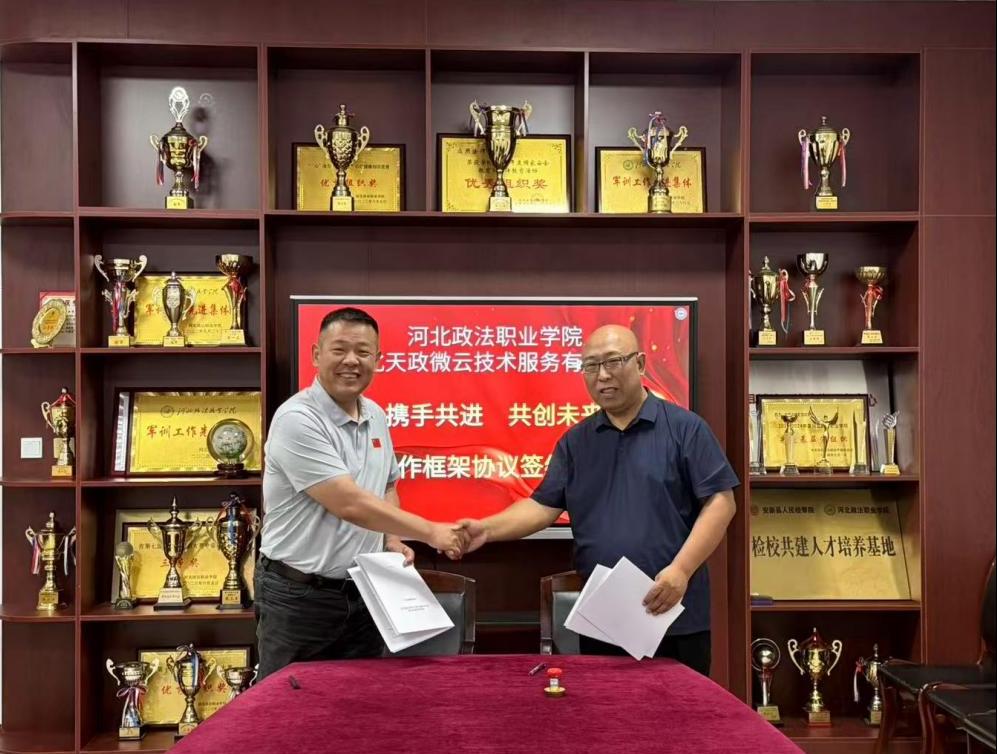 2025年6月24日,学校与河北天政微云技术服务有限公司举行合作框架协议签约仪式。双方基于资源共享、优势互补原则,以提升法律职业在职人员专业素养和实践能力为核心,以具体培训项目为载体,在线下法律职业培训、课程与资源开发等方面开展深入合作,以培养适应新时代法治建设需求的高素质法律职业人才,为法治河北提供人才支撑。应用法律系部分教师参加活动。