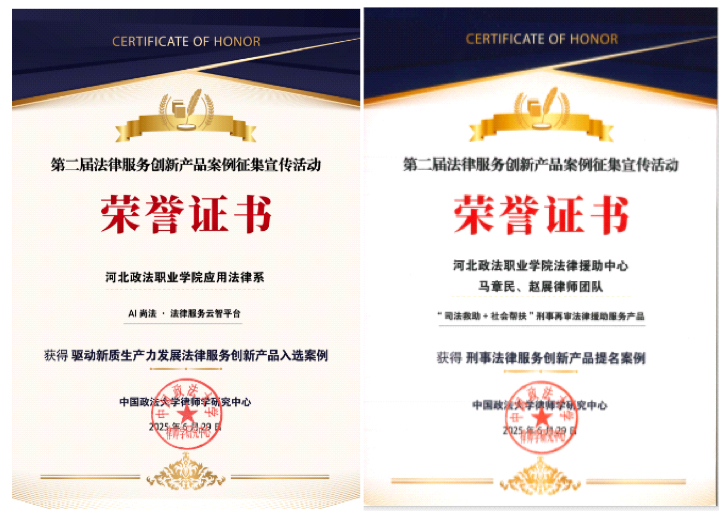 2025年6月,在由中国政法大学律师学研究中心主办,法制日报社、新华网、法治网、北京广播电视台等权威媒体鼎力支持的“2024-2025法律服务创新产品论坛暨第二届法律服务创新产品案例发布会”上,学校法律服务(援助)中心AI尚法·法律服务云智平台获全国驱动新质生产力发展法律服务创新产品入选案例,马章民、赵展律师团队“司法救助+社会帮扶”刑事再审法律服务产品获刑事法律服务创新产品提名案例。